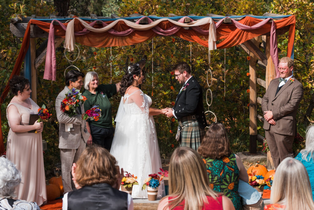 Kyle and Selena’s Horseshoe Lodge wedding in Beulah, Colorado felt exactly like fall in the mountains should feel warm in color, steady in spirit, and rooted in the landscape around them. Their ceremony space sat beneath tall pines, framed by a simple wooden arbor draped in layered autumn fabric rust, muted blue, soft peach. Pumpkins […]